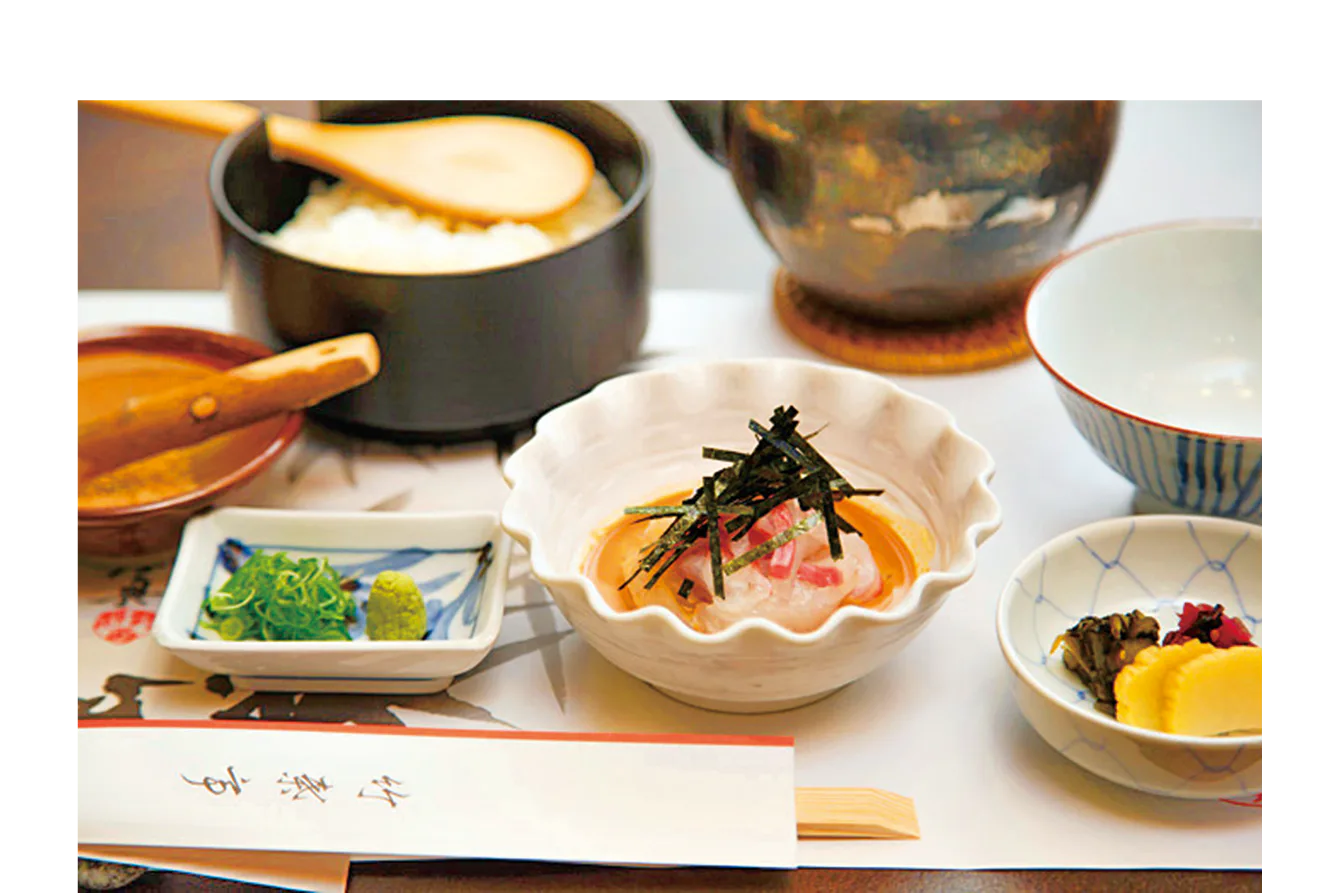ごまダレに漬かった鯛の刺身をご飯にのせ、番茶をかけていただく人気の逸品