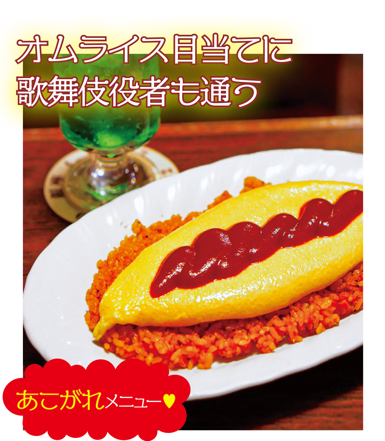 創業から40年以上も愛される喫茶店。オムライスのほか、ナポリタンやカレーなどを求めて歴代の歌舞伎役者も通うことで知られる。