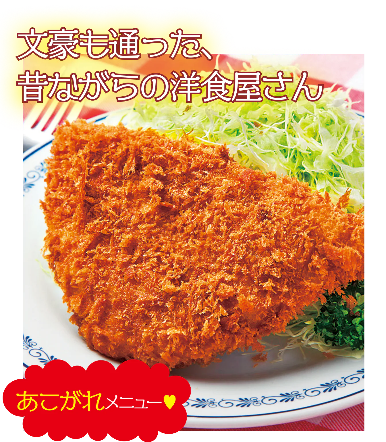明治28年(1895)に創業した、洋食店の先駆け的存在で、オムライスやカキフライを考案した店としても有名。人気の元祖ポークカツレツは、文豪・池波正太郎が1日に3皿平らげたとの逸話も。客席は地下1階から3階まで。人気店のためランチは開店直後の来店がおすすめ。