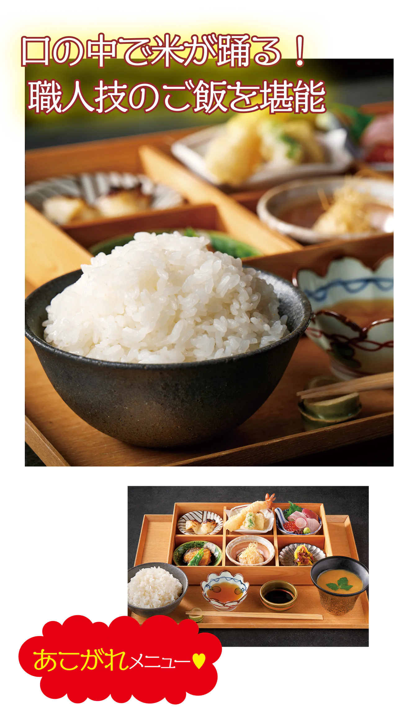 米マイスターによる常に炊きたてのご飯を何杯でも楽しめる専門店。香り、食感、甘さ、のど越しにこだわった極上米「翁霞(おきなかすみ)」が味わえる。オリジナルの土鍋で炊き上げたご飯を提供。