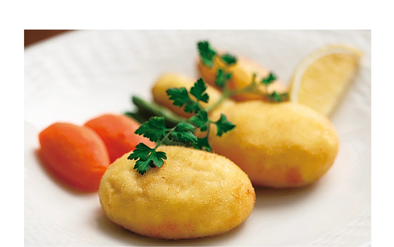黄金色に光る美しいコロッケ。細かいパン粉を使用してやさしい口当たりに
