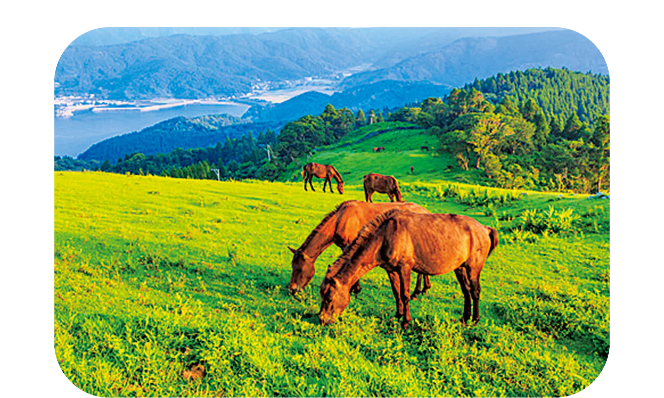県最南の串間市にある広大な丘陵地・都井岬。太平洋を見渡す広大な草原に貴重な国の天然記念物・御崎馬が放牧されており、のどかな風景が広がる。