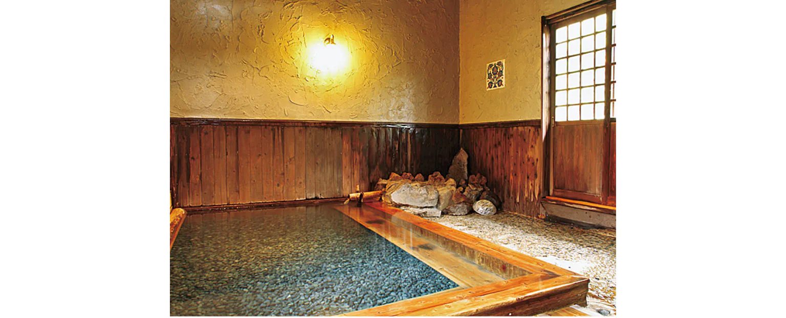 敷地内に泉質の異なる4つの源泉が湧く。開放的な露天風呂や、ひなびた風情の内風呂に注ぐ湯が点在するので、湯めぐりが楽しめる