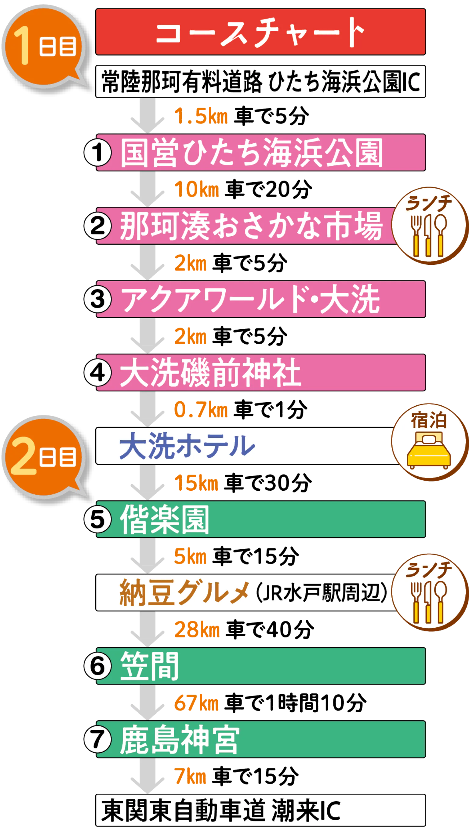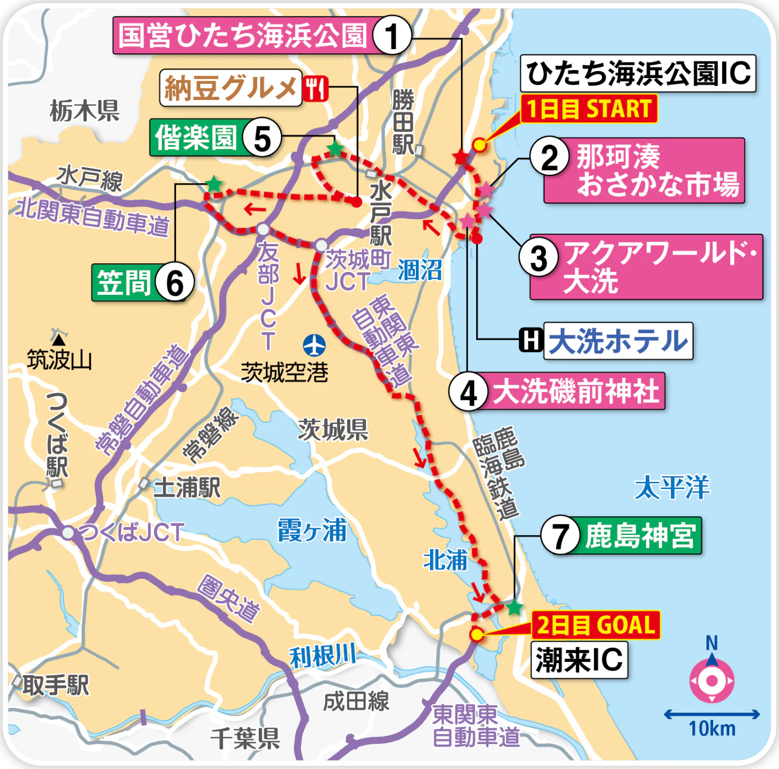 茨城の定番スポットを巡るモデルプラン。県内は広いが、車なら快適に移動できる。花や海鮮など魅力満載のドライブを楽しもう。