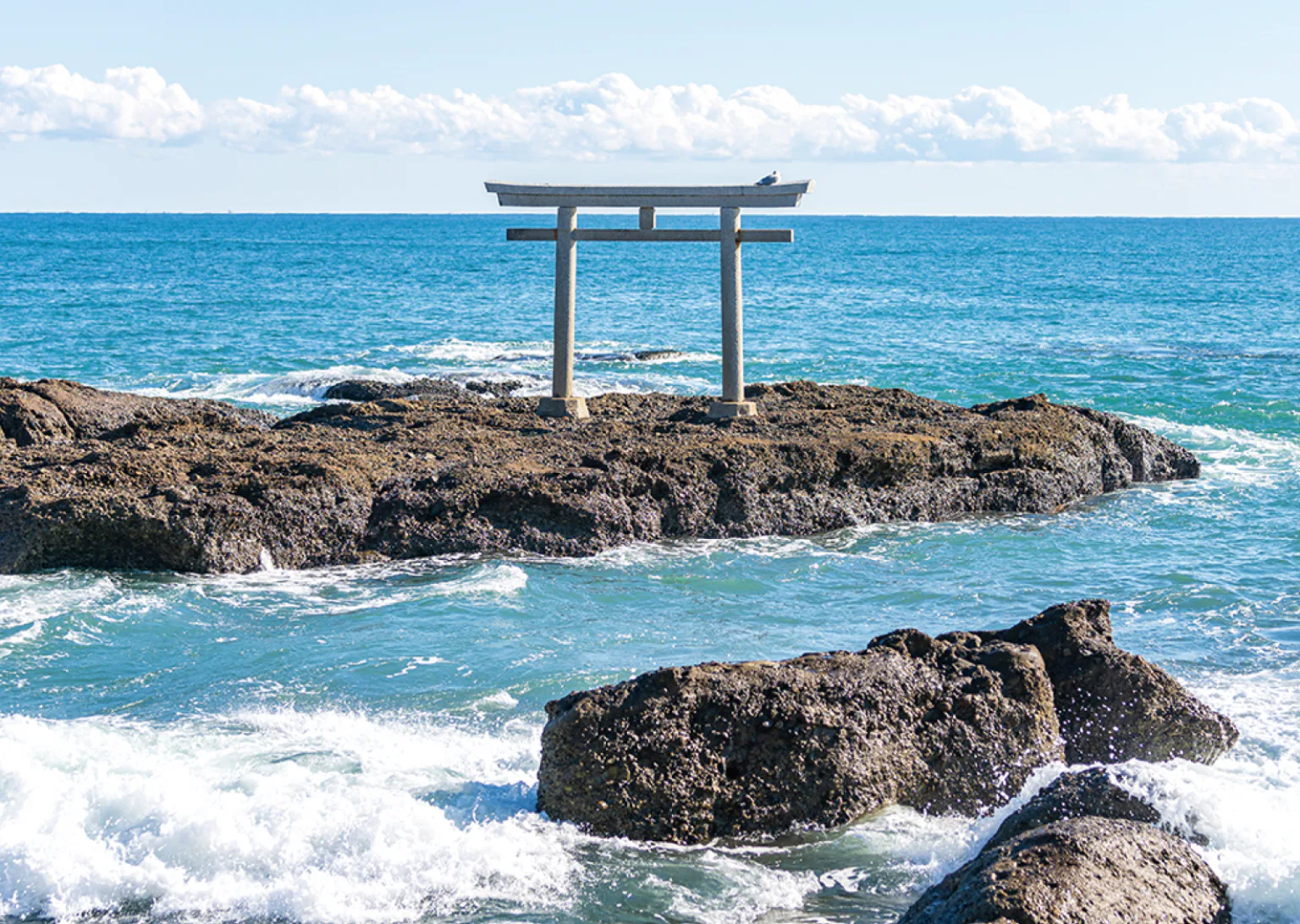 大洗磯前神社の鳥居の一つで、神が降り立ったといわれる神磯の鳥居。特に日の出の瞬間は鳥居が朝日に照らされ、神々しい光景が見られる。