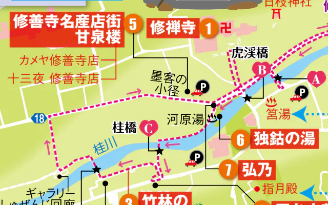 鎌倉幕府二代将軍・源頼家と修善寺で暮らしていた桂との恋を描いた『修禅寺物語』の舞台が桂川。この川に架かる5つの橋に願いをかけながら渡ると、恋が成就するといわれている。橋に付けられた別名も要チェック!