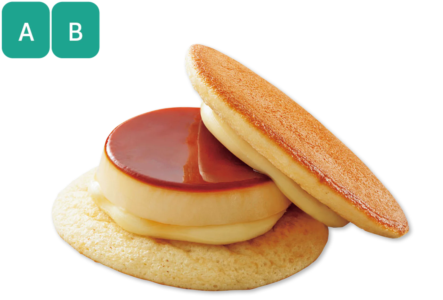 大きなプリンをまるごとサンドした和洋折衷のどら焼。カラメルのほろ苦さとふわふわパンケーキのようなどら生地がマッチ