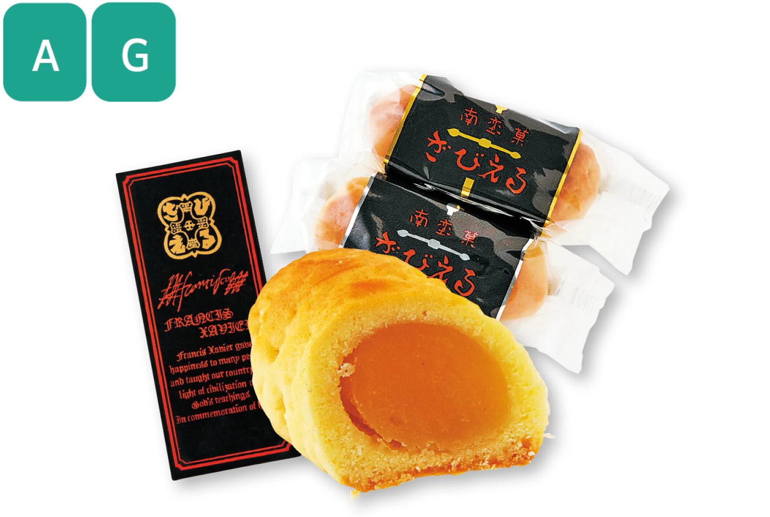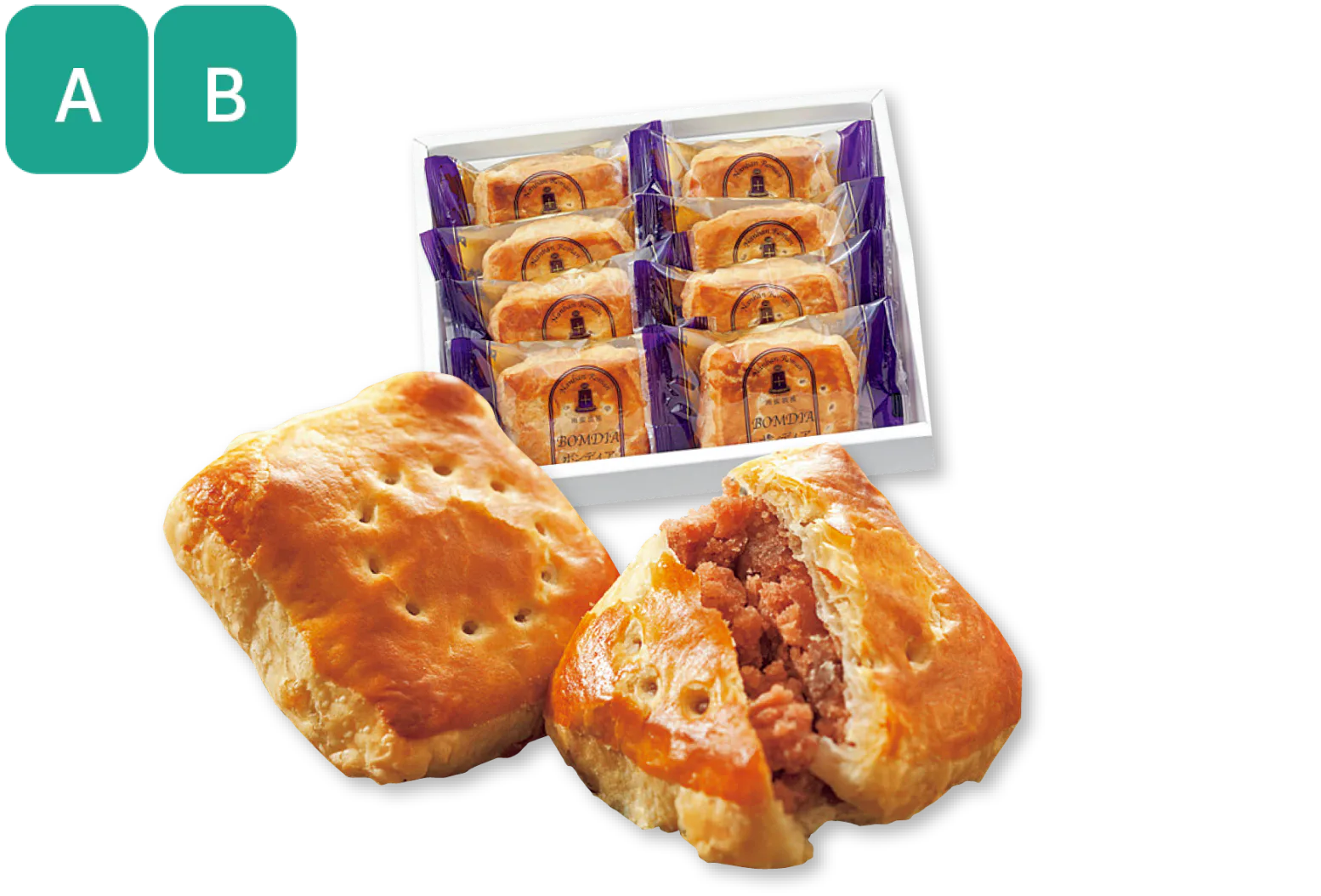 昭和53年(1978)にポルトガルのアベイロ市と大分市が姉妹都市となった記念に作られた、クルミ入りの小豆餡をパイ生地で包んだお菓子