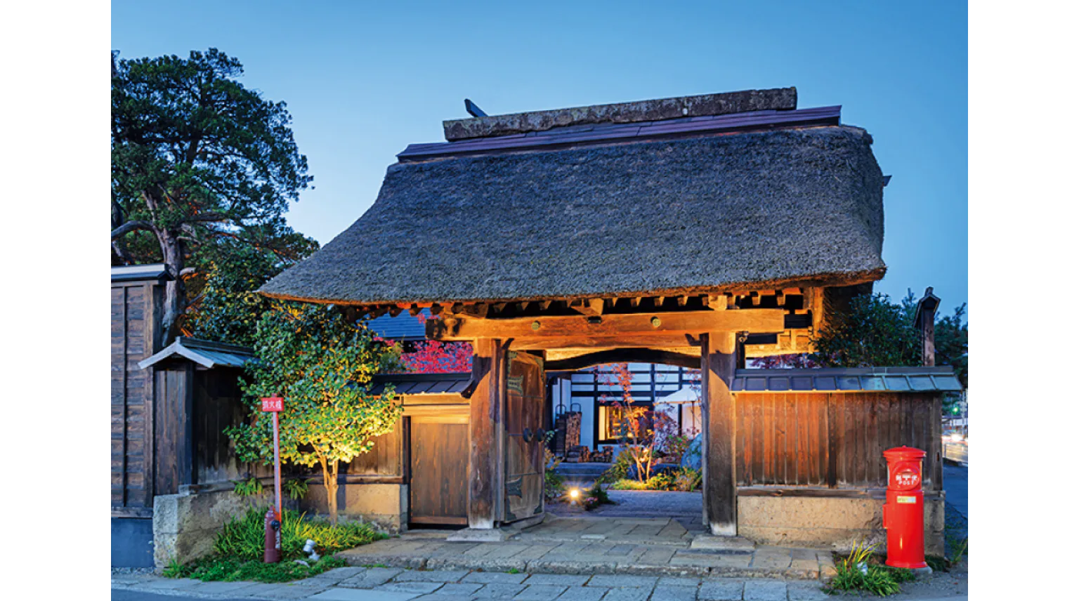 宿のシンボルは400年の歴史を持つ薬医門。大きな門扉はケヤキの一枚板