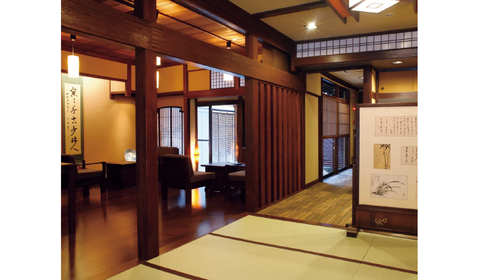 共有スペースのラウンジ。客室は本館と新館・遊墨庵の2タイプで、どちらも純和風の造り
