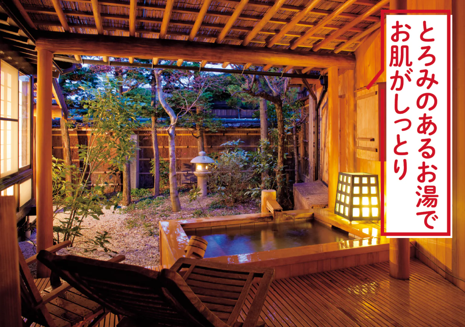 客室に備える露天風呂でも美肌の湯を満喫できる