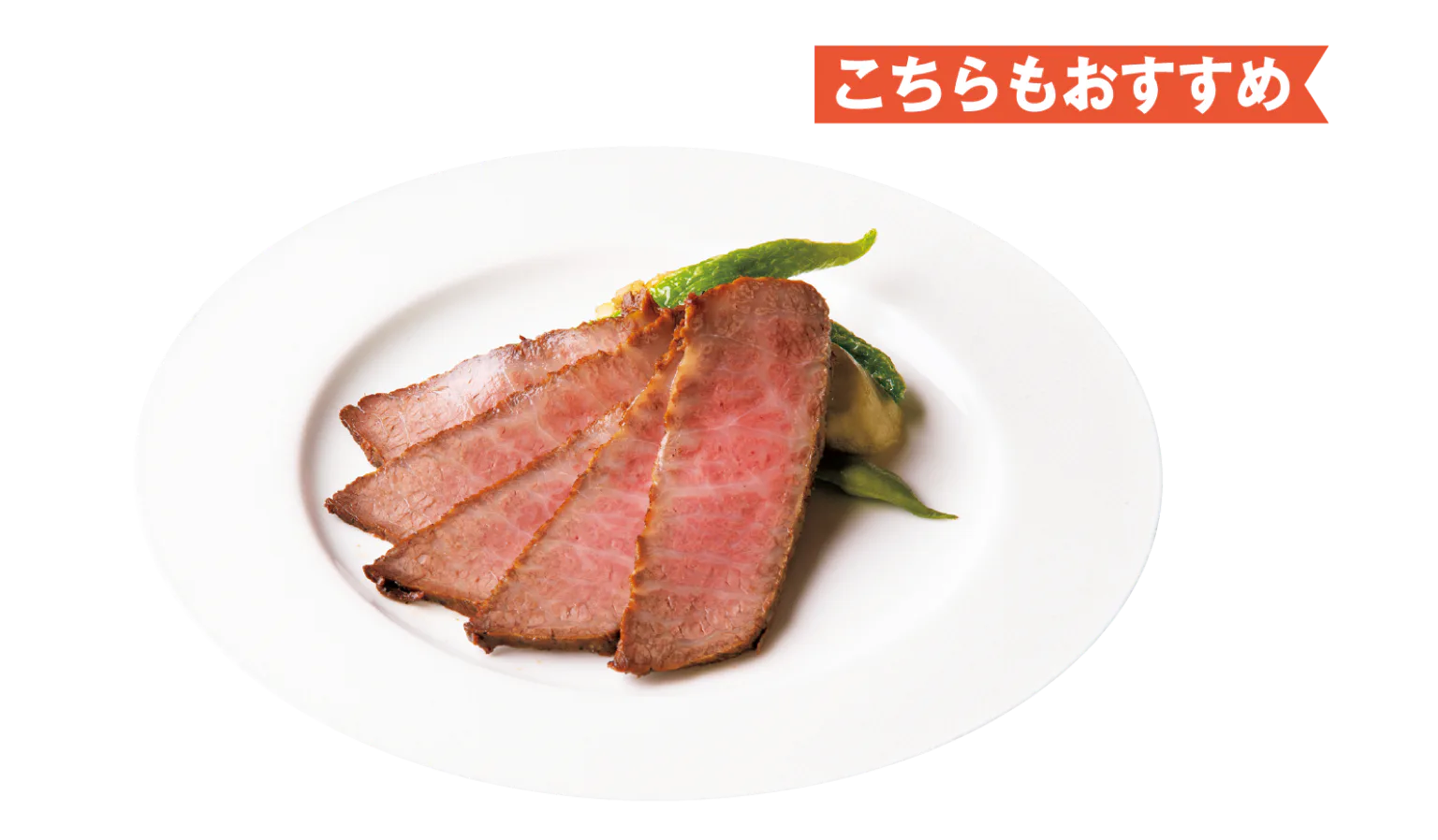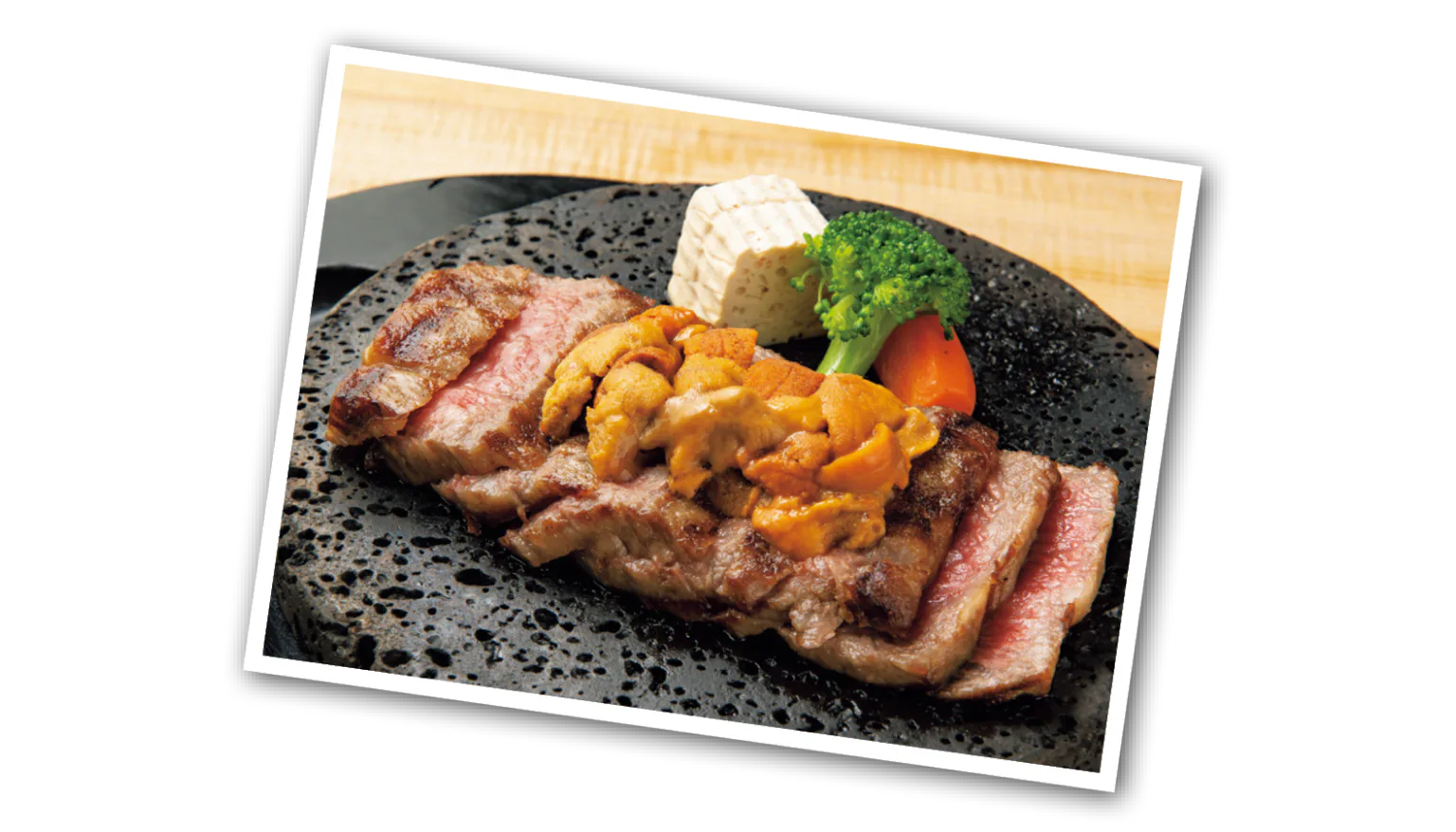 ステーキはサーロイン、リブロース、フィレ、モモから選べ、寿司はトロ、ウニ牛、アワビなど8貫。