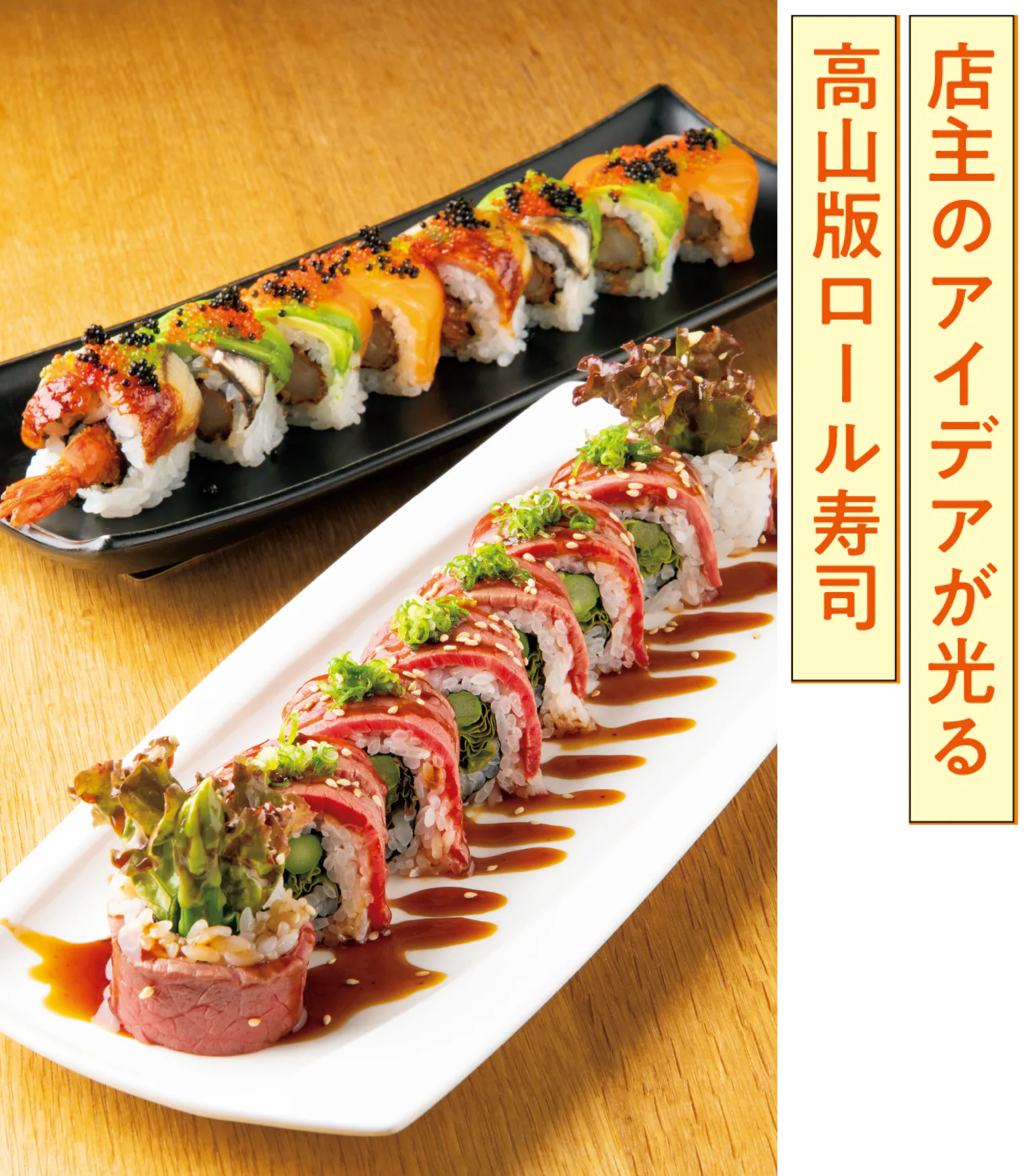 オリジナルロール寿司が看板メニュー。20種類以上のロール寿司のほか、肉料理や揚げ物、ご飯もの、デザートなどの食事メニューも豊富。飛騨産トマトを使ったカクテルもおすすめ。