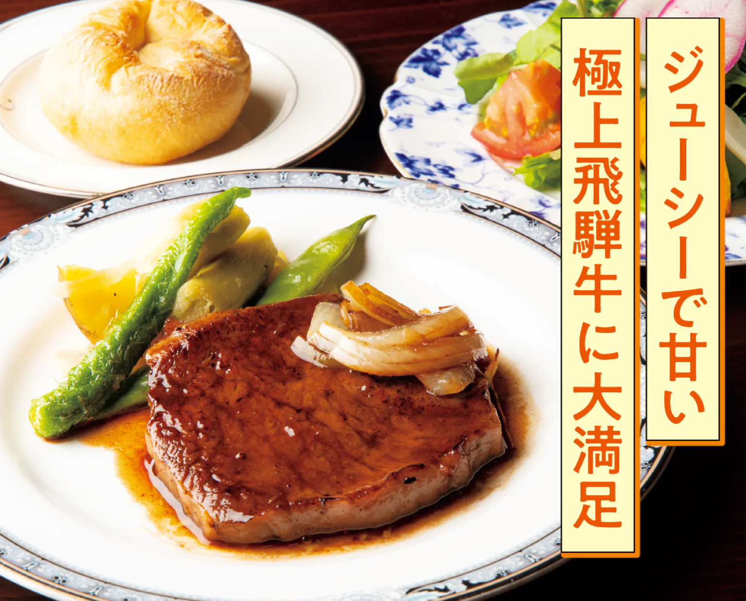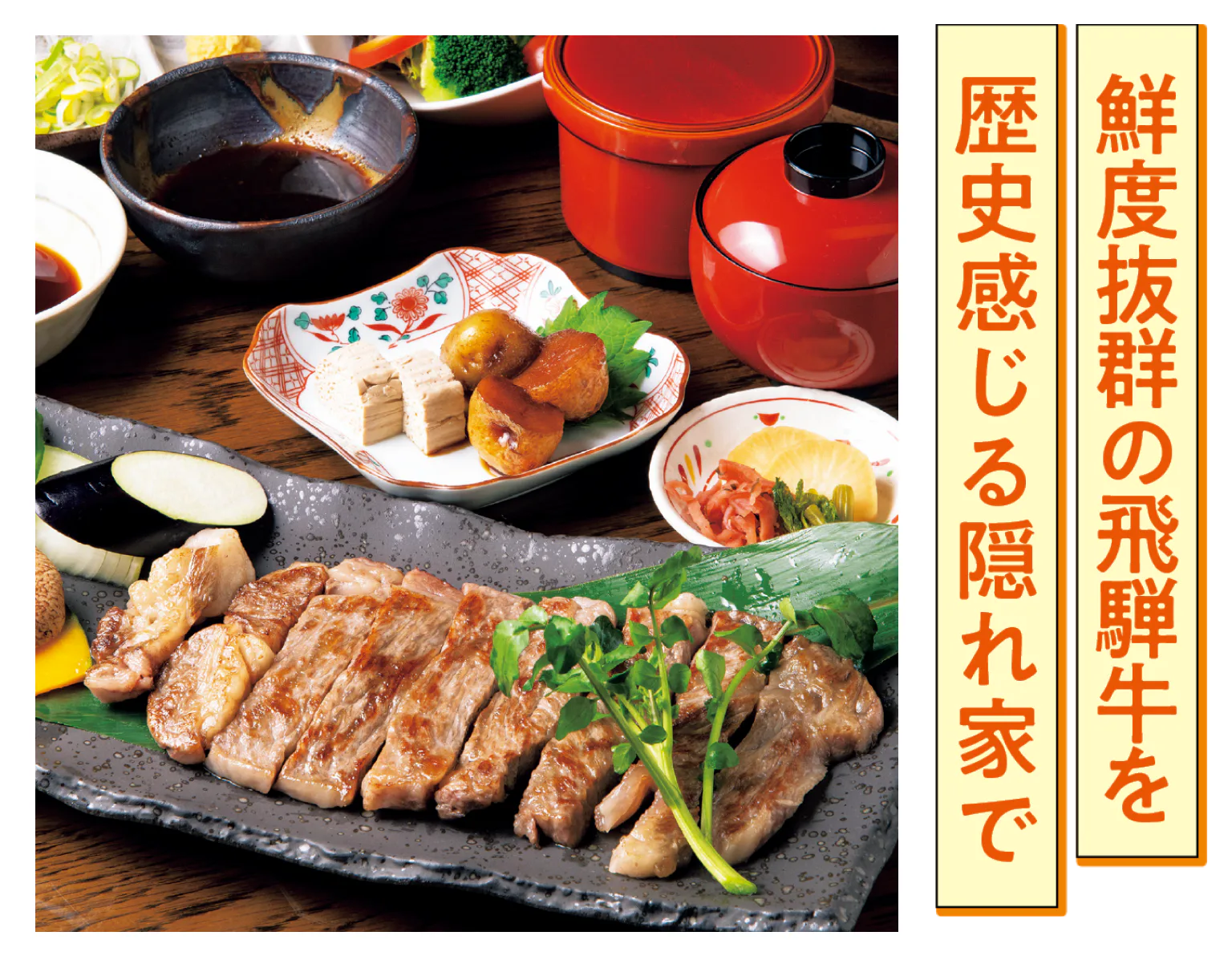 昭和39年(1964)創業の飛騨牛専門店。厳選した最高級飛騨牛は、独自の焼き方でふっくらジューシーに焼き上げる。サーロインステーキは120g5167円(A4等級)から選べ、ステーキ以外の飛騨牛料理も提供している。