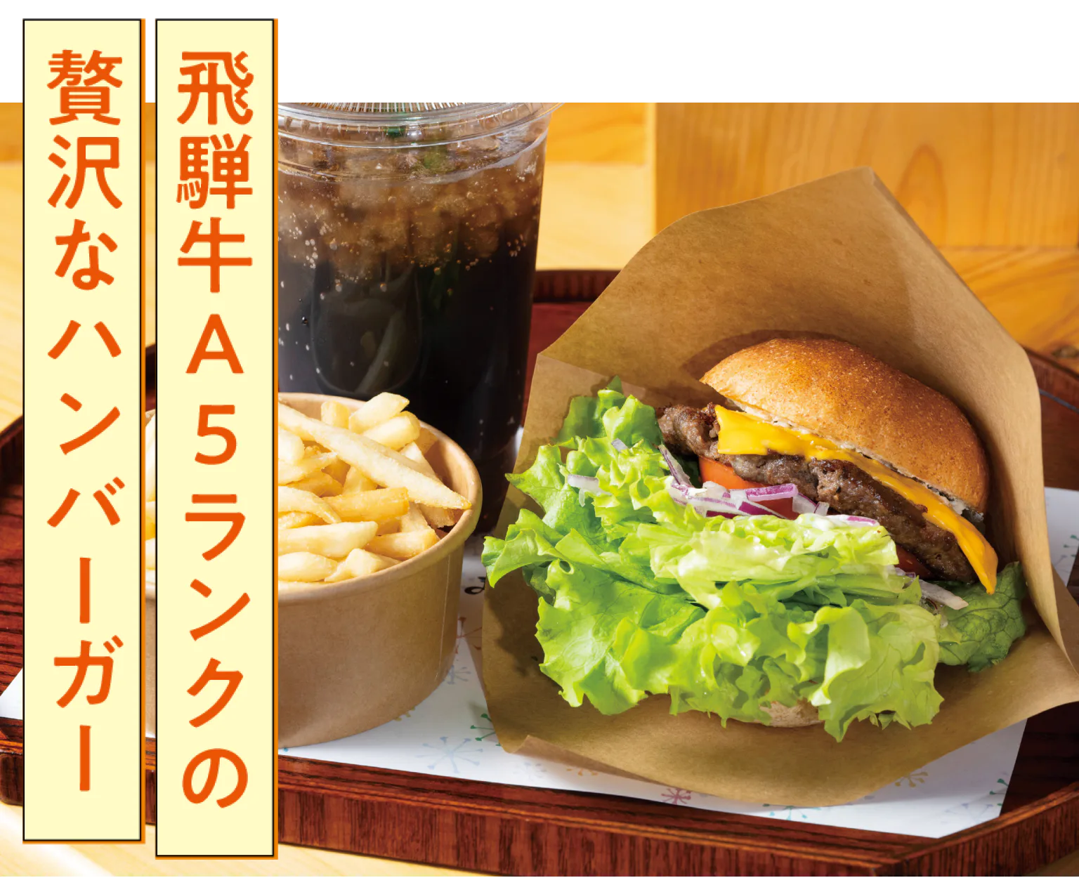 飛騨牛A5ランク使用のハンバーガーを筆頭に、豪快な海鮮バーガーやステーキバーガーを販売。バンズやレタスも地元産のものを使用している。