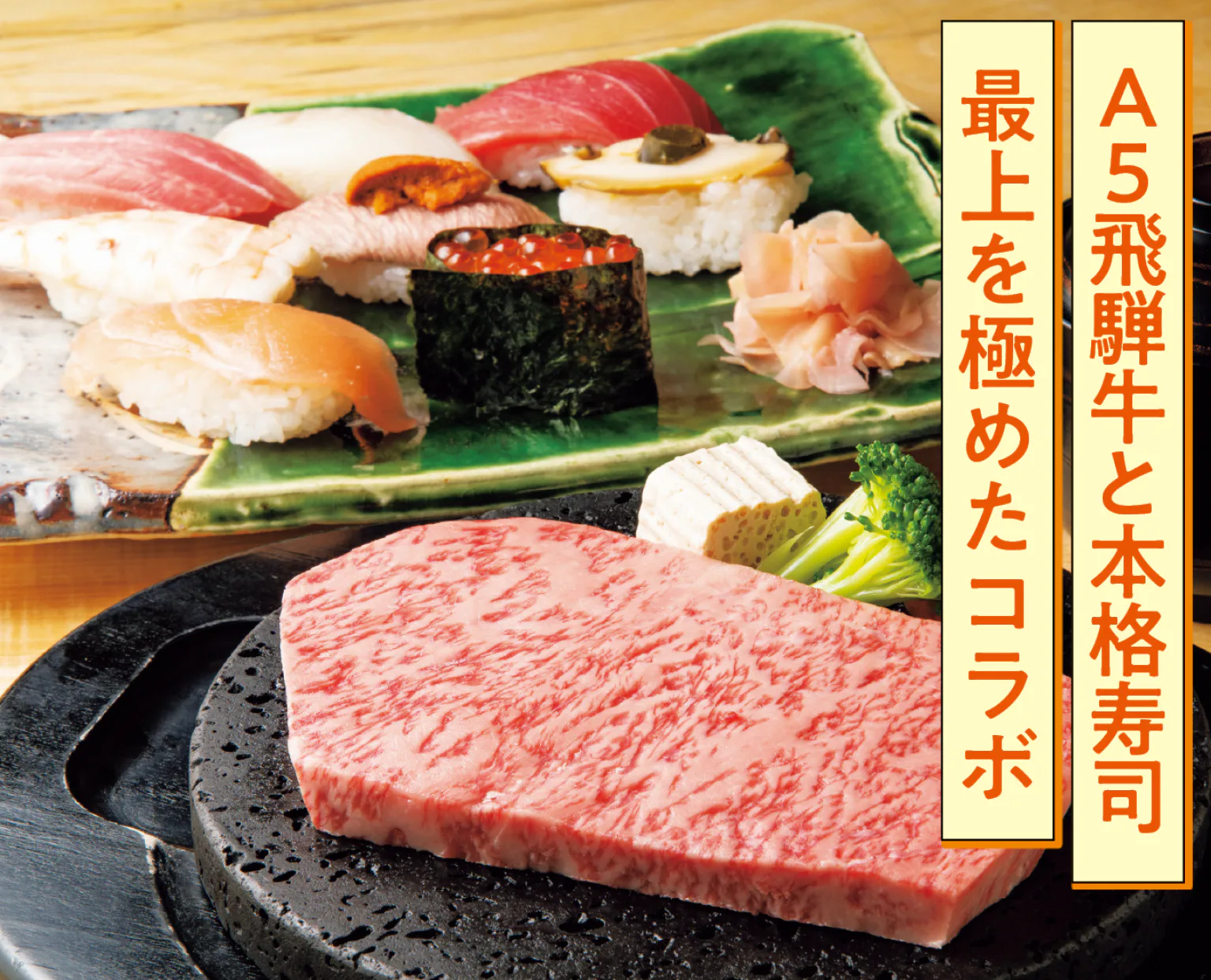 A5等級のサーロイン、リブロース、モモを炭火で焼くステーキを主力に、職人が北陸の鮮魚で握る寿司も揃う。ステーキと寿司のセットや、単品料理などメニュー豊富。高山駅から近く便利な立地にある。