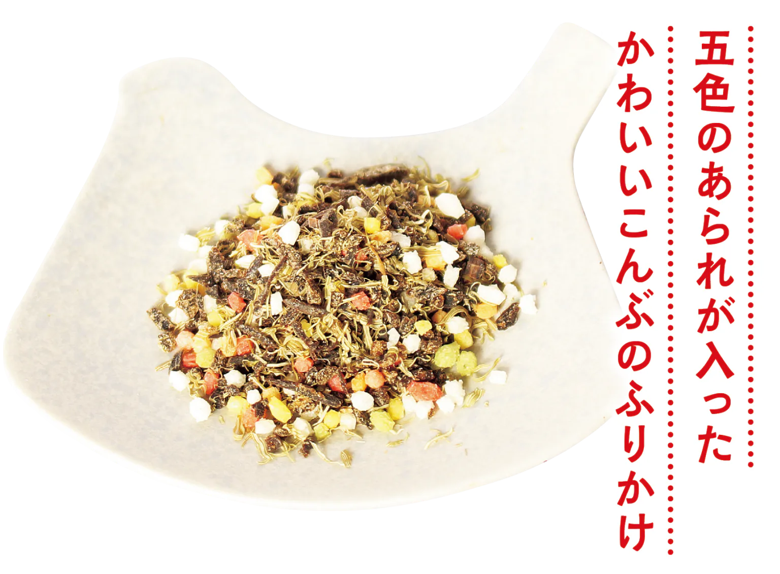 細かいしおふき昆布ととろろ昆布に五色のあられを合わせた、見た目も華やかな昆布のふりかけ。※内容量は変更になる場合あり