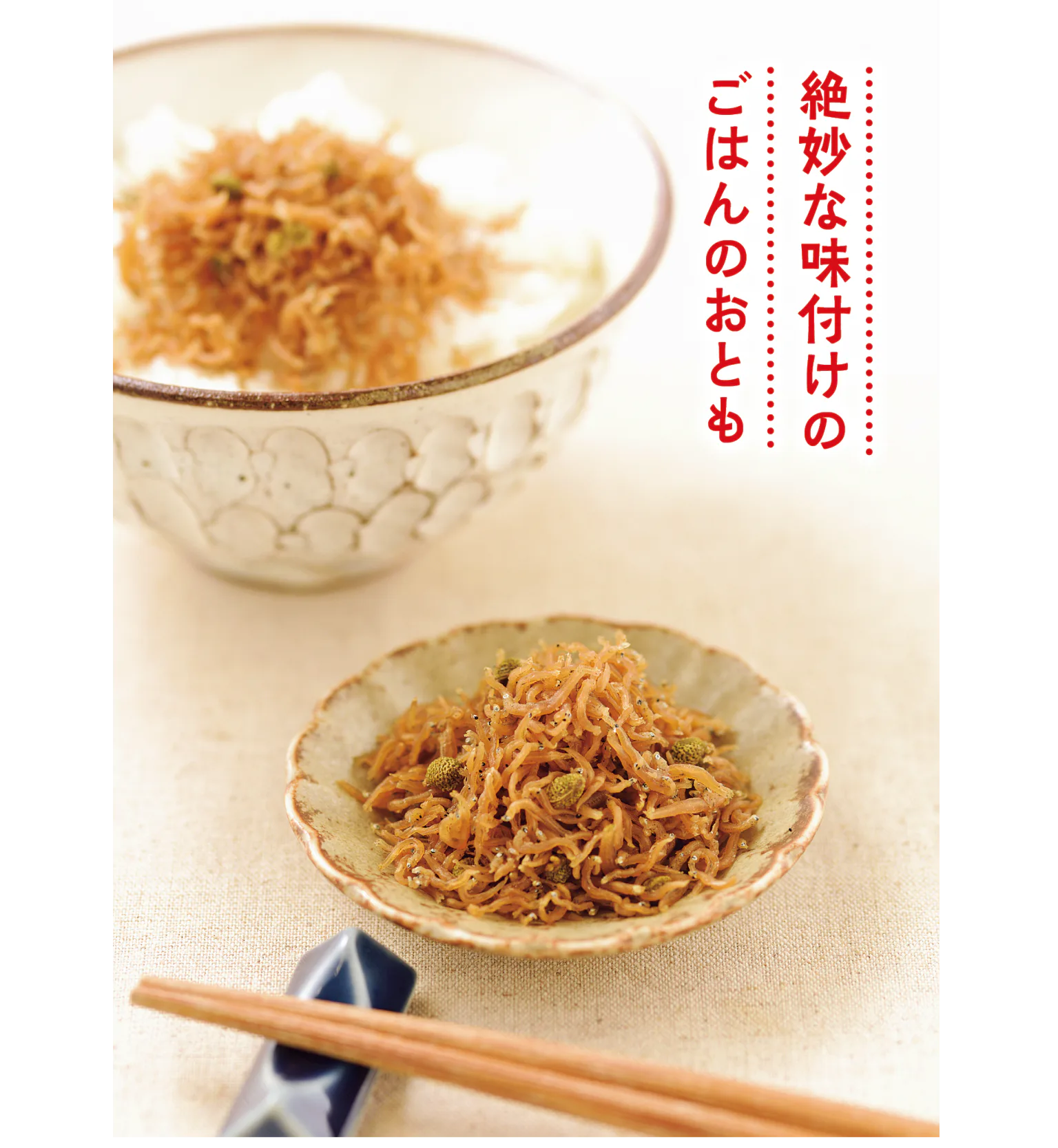 尾頭がついたちりめんじゃこと実山椒を炊き上げる。サラダのトッピングやパスタにもおすすめ