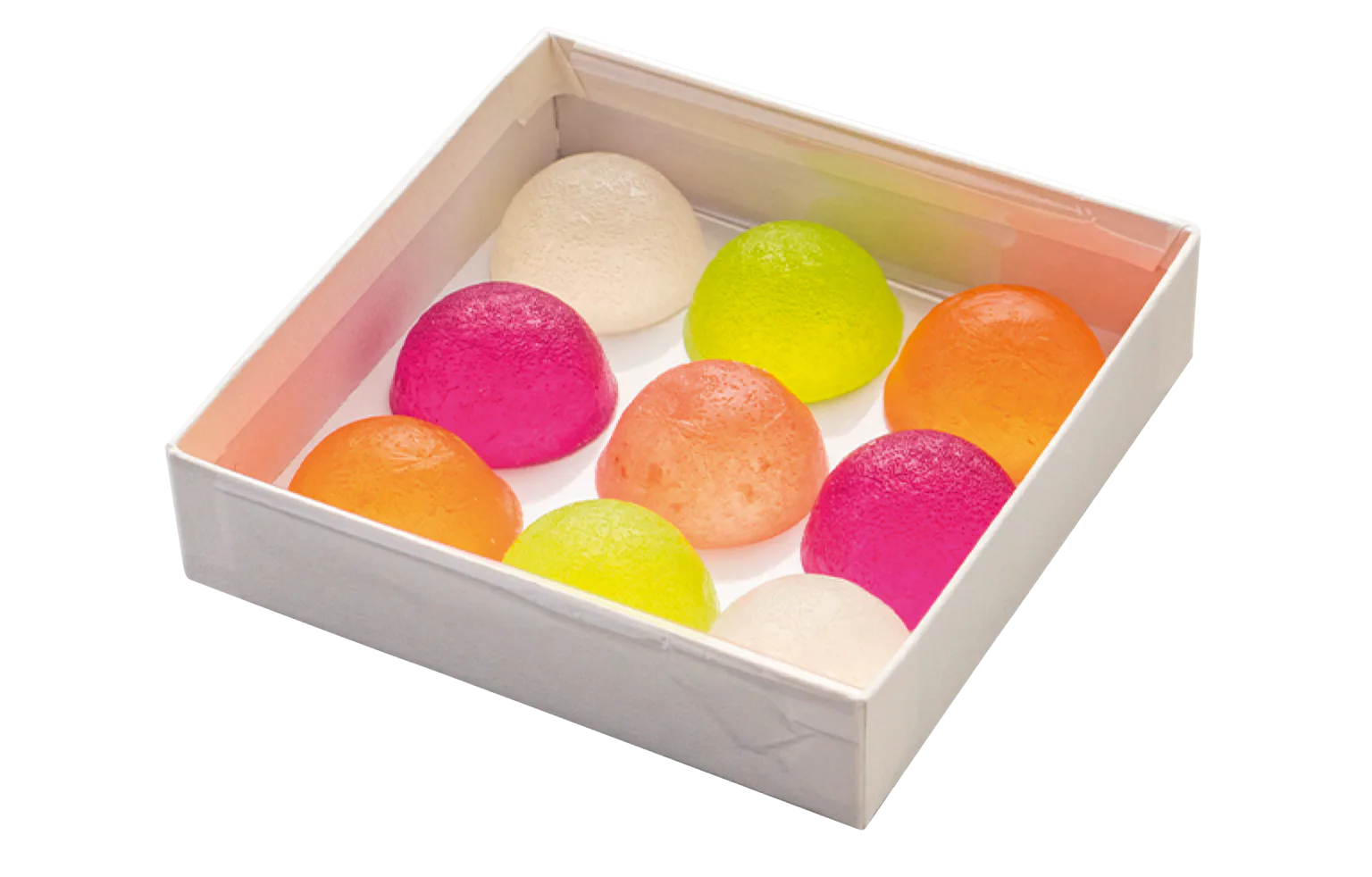 ラ・フランス、サクランボ、イチゴ、メロン、ブルーベリーの5つの果汁を使った琥珀糖。シャリシャリした食感が楽しい SNS で話題の人気商品!
