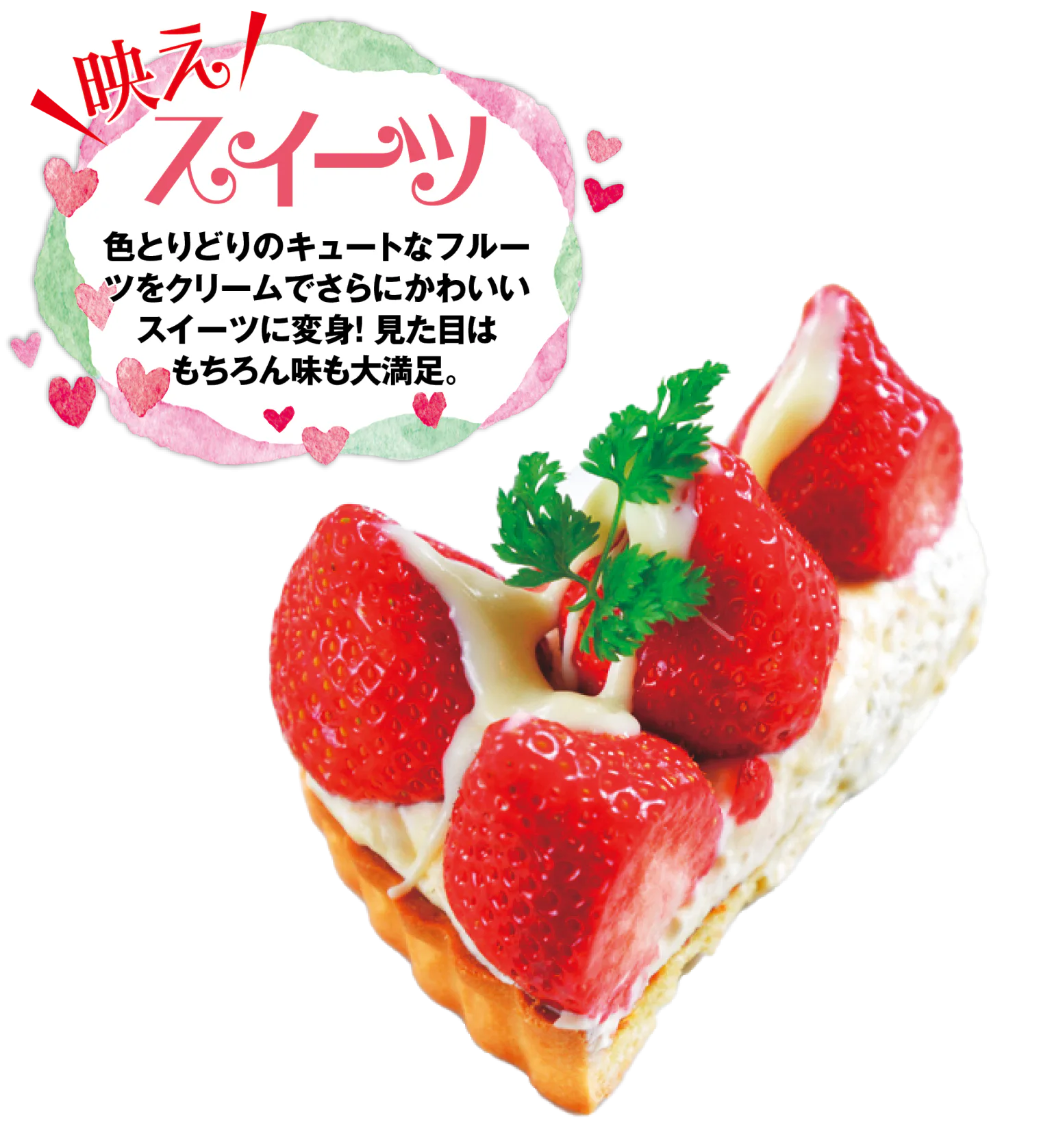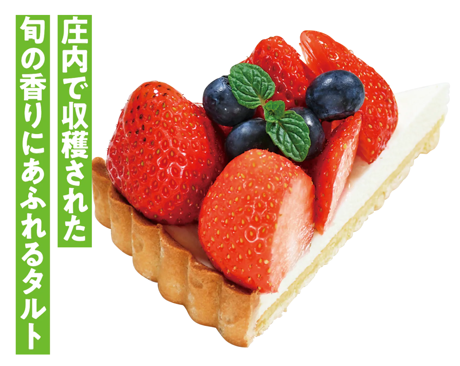自家製カスタードクリームに庄内産イチゴ「やよいひめ」をのせホワイトチョコソースをとろり