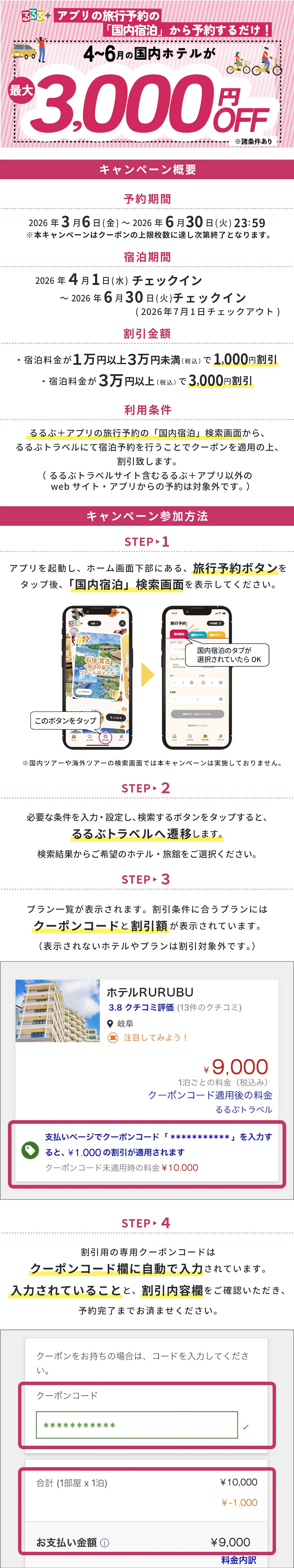 ■注意事項 ・キャンペーン適用条件に合致しているにも関わらずクーポン表示がない場合は、配布上限枚数を超えているとお考えください。 ・クーポンコードによって、利用できる宿泊施設が限定されている場合がございます。なお、海外ホテルは全て本クーポン対象外です。 ・クーポンコードには上限枚数がございます。上限枚数に達した場合ご利用できませんのでご注意ください。 ・クーポンコードについては、るるぶトラベルサイト上でのご予約のみご利用いただけます。 ・ご予約完了後に、クーポンコードを適用することはできません。 ・クーポンコードの対象予約期間を過ぎてから取消(キャンセル)した場合、クーポンコードは再利用できませんのでご注意ください。 ・1回の予約に利用できるクーポンコードは1つのみになります。複数のクーポンコードを組み合わせてのご利用はできません。 ・予約を変更またはキャンセルする場合、クーポンコードが使用されたかどうかに関係なく、完了後に予約を変更することはできません。変更が必要な場合は、現在の予約をキャンセルして再度予約してください。なお、その際にキャンペーン期間が終了していた場合は、割引は適用されません。 ・クーポンコードを使用した予約でキャンセル料が発生する場合、キャンセル料は割引が適用される前の費用に基づいて計算されます。 ・クーポンコード利用の権利は、他人へ譲渡、換金、変更できません。 ・クーポンは予告なく終了する場合がございます。予めご了承ください。 ・利用上限枚数に達した場合、同条件のクーポンコードを追加で発行する場合があります。 ・利用上限枚数に達した後に取消が発生した場合、クーポンコードを再配布する場合がございます。 ・本キャンペーン内容は予告なく変更されることがあります。変更された場合は、変更後の内容が直ちに適用されます。 ■お問い合わせ 【本キャンペーンおよびるるぶ+アプリについて】 株式会社JTBパブリッシング メディアコミュニケーション部 rurubu-app@rurubu.ne.jp 【るるぶトラベルでの予約およびクーポンを用いた操作方法全般について】 株式会社JTB 下記リンクボタンよりお問い合わせください。 ※遷移先のページにてプルダウンを選択するとページが更新されます。 ページ下部に表示される「解決できない場合はこちら」をタップすると るるぶトラベルへのサインインなしでお問い合わせいただけます。