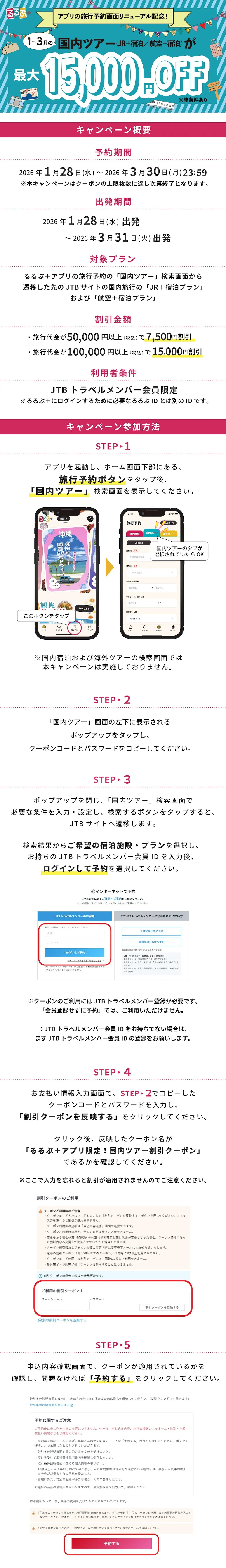 ■注意事項 ・このクーポンは、利用者条件と合致しないクーポンとの併用はできません。 ・このクーポンは、お1人様1回までのご利用となります。 ・金券付きの商品は割引対象外となります。また、人数変更が発生した場合には取消・再予約となります。ただし、再予約時にクーポンが配布終了あるいは本キャンペーン概要に合致せず新たにクーポンをご利用いただけない場合がございます。この場合の責任は負いません。 ・利用枚数上限に達した場合、「クーポンの利用枚数が上限に達しています」等のメッセージが「支払情報入力」画面にて表示されます。利用枚数上限に達している場合は予約期間内であっても、ご利用いただけません。 ※クーポン利用枚数が上限に達した場合配布終了となりますが、更新タイミングによってはクーポンコードを記載しているポップアップに「配布終了」表記がない場合がございます。予約手続き中完了画面が表示される前に利用枚数上限に達した場合、予約エラーとなり再度お手続きをいただいてもクーポンはご利用いただけませんのでご了承ください。 ・必ず申込内容確認画面にて、ご希望クーポン額の割引が適用されているか確認してください。予約完了後にクーポンを適用することはできません。 ・このクーポンは、規定の条件を満たす国内ツアー(宿泊を含む)のお支払いにのみご利用いただけます。それ以外の商品にはご利用いただけません。国内添乗員同行ツアーにもご利用いただけません。 ・このクーポンは、るるぶ+アプリの旅行予約の「国内ツアー」検索画面から遷移した先のJTBサイト上でのWeb予約にのみご利用いただけます。クーポンの利用には、予約時に該当クーポンコードとパスワードの入力が必要です。必ず申込内容確認画面にて、ご希望クーポン額の割引が適用されているか確認してください。予約完了後にクーポンを適用することはできません。(既にお申込みが完了しているご予約への後からのご利用はできません。) ・ご利用には、JTBトラベルメンバー会員登録が必要です。「会員登録なし予約 」ではご利用いただけません。 ・ご旅行代金の合計がクーポンの利用額を下回る場合、差額返金はありません。また、差額分を次回のご旅行にご利用いただくこともできません。 ・複数予約のお支払いにまとめてクーポンを適用することはできません。 ・誤ったクーポンコードを入力した場合や本キャンペーン概要に合致しない場合、「ご指定のクーポンは存在しません」等のメッセージが「支払情報入力」画面にて表示されます。クーポンコード、パスワード、本キャンペーン概要をご確認ください。 ・クーポン利用の権利は、他人へ譲渡、換金、変更できません。 ・予約取消の際に発生する取消料は、クーポンやポイント利用前の旅行代金に対し算出されますので、ご注意ください。クーポンは取消料へは充当できません。 ・人数変更や第1希望以外の列車で確定した場合など、ご予約・受付完了後に旅行代金が変更となった場合、クーポン条件に沿った割引額に変更し再決済される場合があります。クーポン割引額及びお支払い金額の変更内容は株式会社JTBより変更完了メールにてお知らせされますので、そちらをご確認ください。 ・利用上限枚数に達し「配布終了」となった場合、予告なく同条件のクーポンを追加で配布する場合があります。 ・利用上限枚数に達した後に予約(クーポン利用)の取消が発生した場合、予告なくクーポンを再配布する場合がございます。 ※追加・再配布の有無等、お問い合わせをいただきましても事前にお応えはいたしかねますのでご了承ください。 ・本キャンペーン内容は予告なく変更されることがあります。変更された場合は、変更後の内容が直ちに適用されます。 ・本キャンペーンは予告なく終了する場合がございます。予めご了承ください。 ■お問い合わせ 【本キャンペーンおよびるるぶ+アプリについて】 株式会社JTBパブリッシング メディアコミュニケーション部 rurubu-app@rurubu.ne.jp 【JTBサイトでの予約およびクーポンを用いた操作方法全般について】 株式会社JTB 下記リンクボタンよりお問い合わせください。